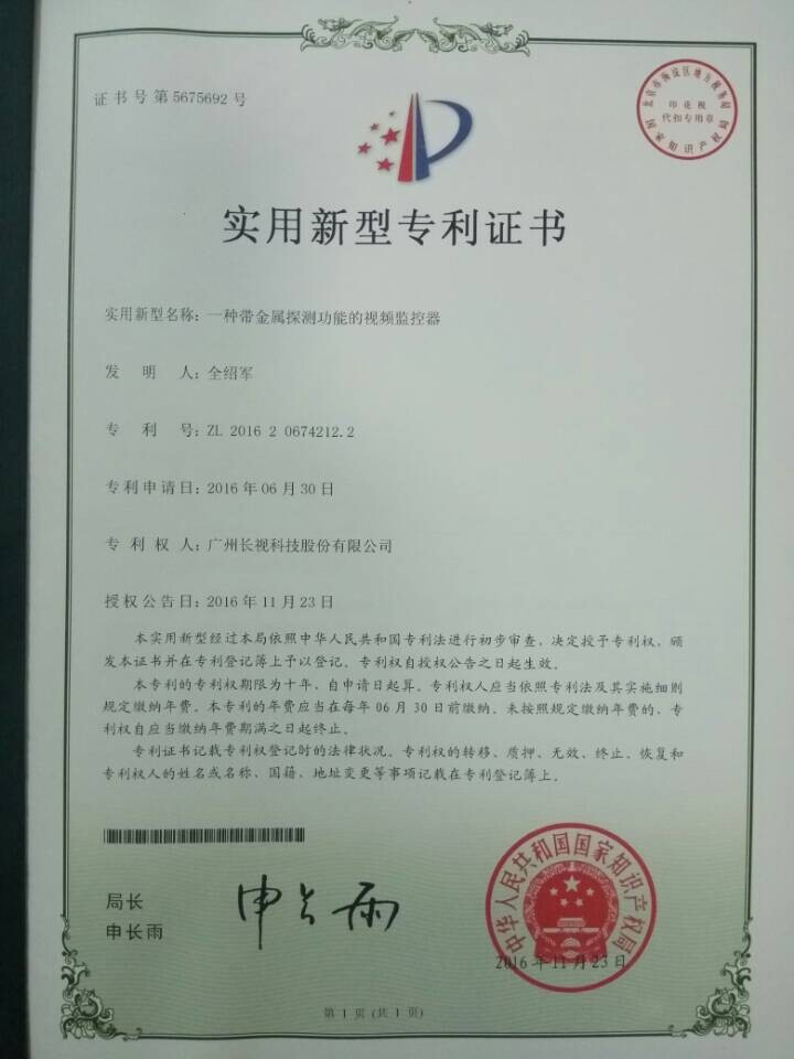 2016年12月20日,長視科技榮獲兩個實用新型專利證書和一個外觀設(shè)計專利證書。